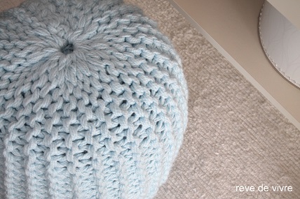 Vlnu Yetti som dávala šestormo a hneď som si to namotala zo šiestich klbiek. Plnila som to starými froté plachtami a čo chýbalo dotlačila zbytkami látok. Ono to môže presvitať, tak najprv som tam vopchala po odvode bledo šedú plachtu (tá cez tú bledomodrú nepresvitá) a do jej vnútra som rovnomerne pchala všetko ostatné, aby vznikol požadovaný tvar. Môžeš do toho uštrikovaného valca vložiť trebárs starú bielu návlečku z podušky a výplň pchať do nej. Záleží na tom akej farby bude sedák. Andrea